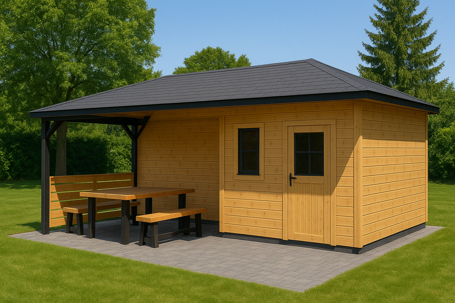 Domek ogrodowy z tarasem i meblami – trwały i funkcjonalny
