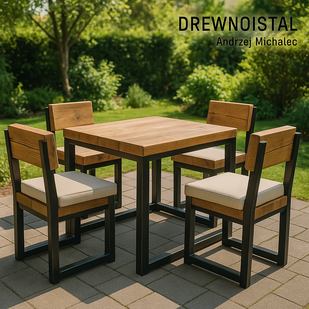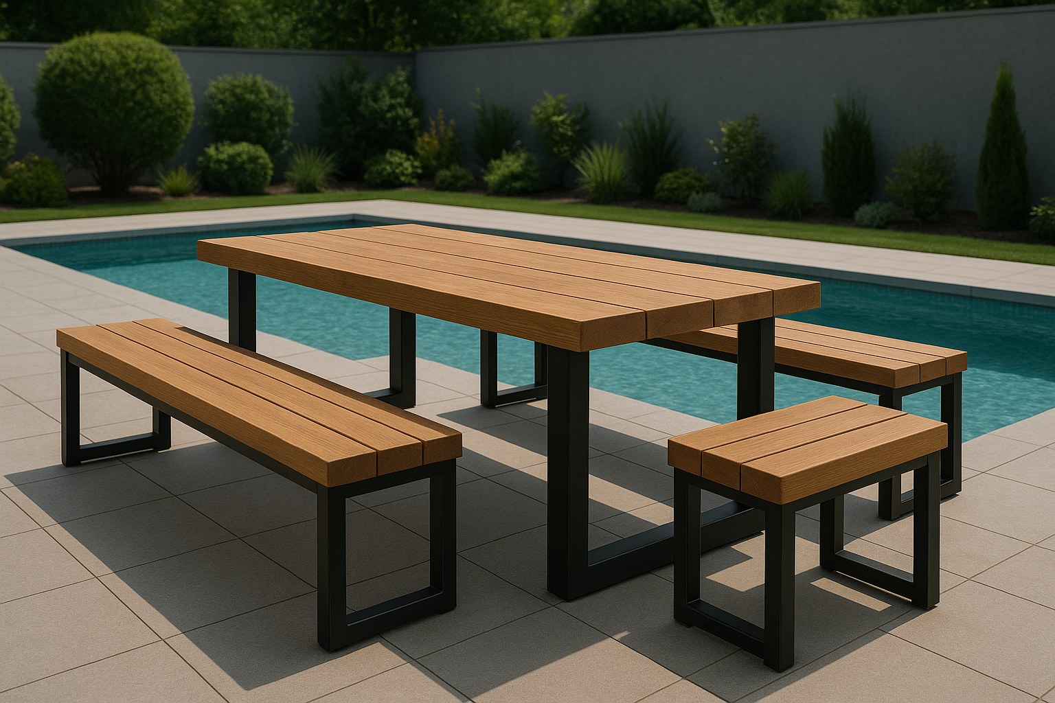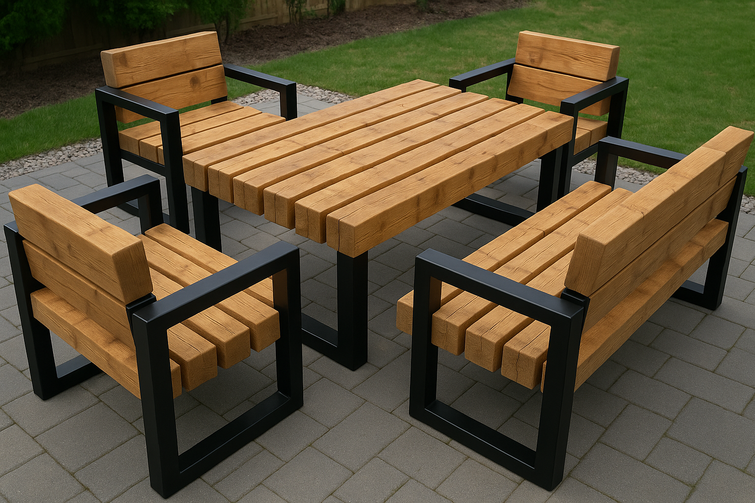 Zestaw z grubego drewna i stali – idealny przy basenie lub ognisku