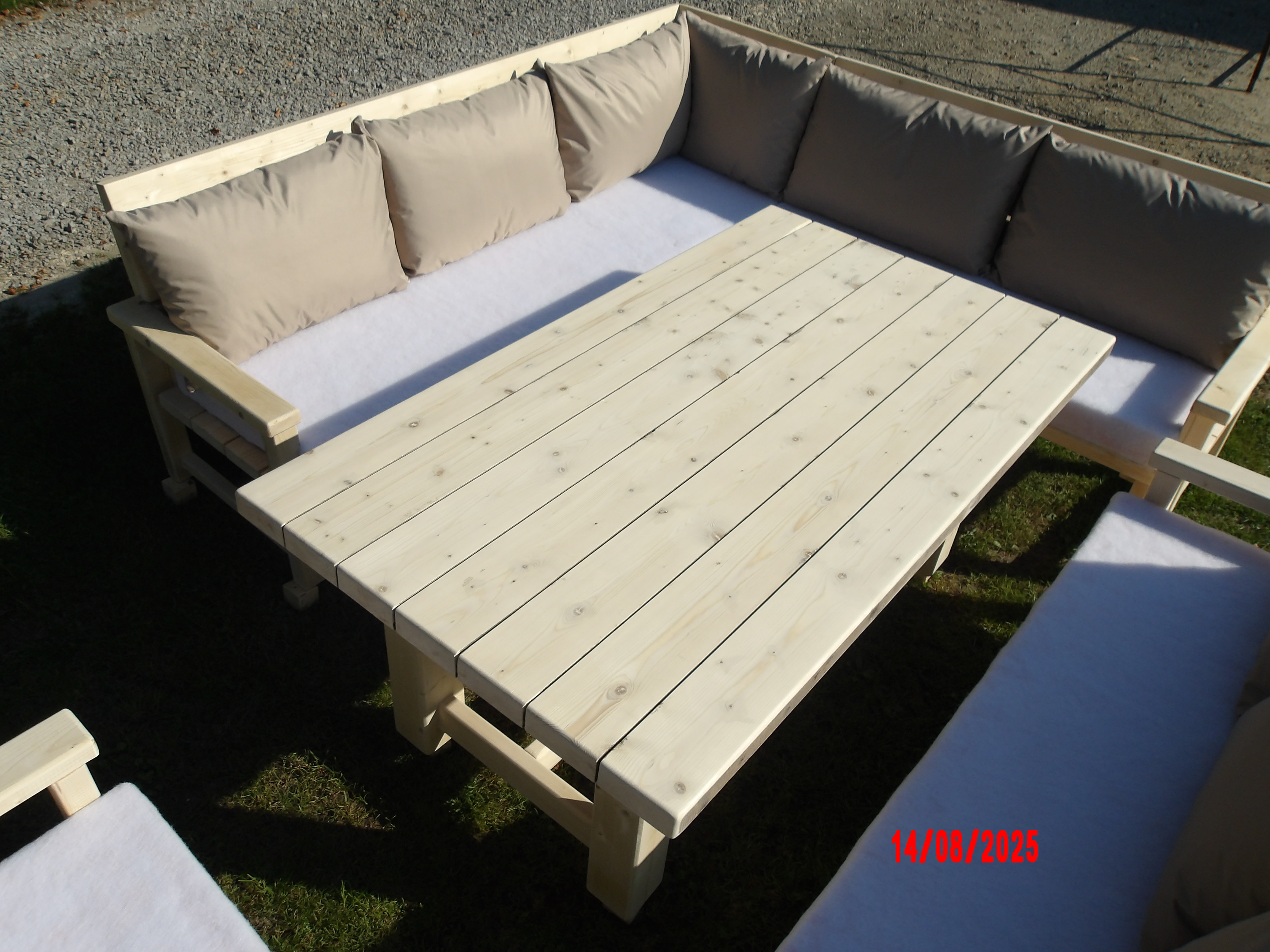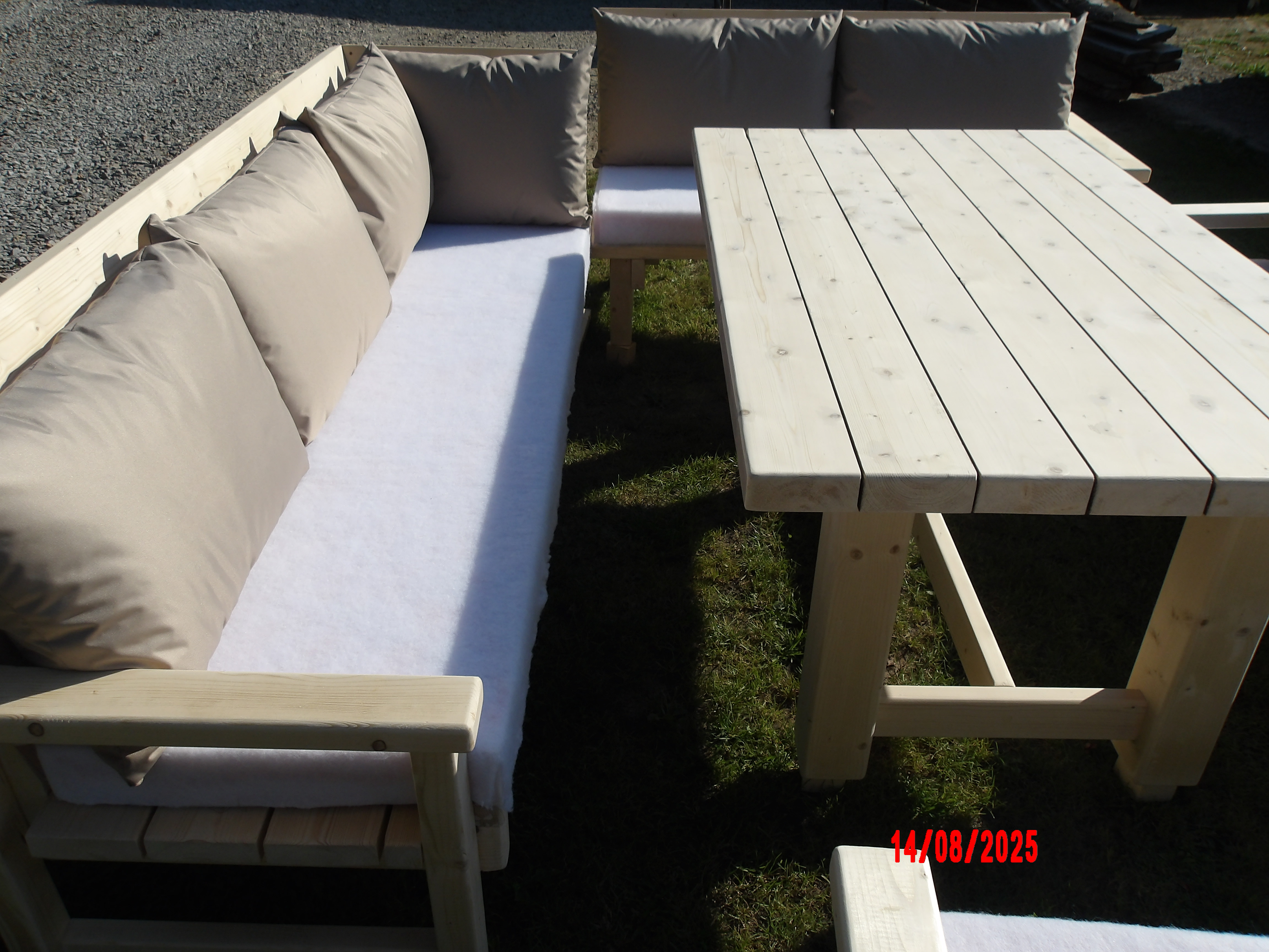 Nowoczesny zestaw mebli ogrodowych z masywną pergolą z grubego drewna – trwałość, styl i komfort na lata